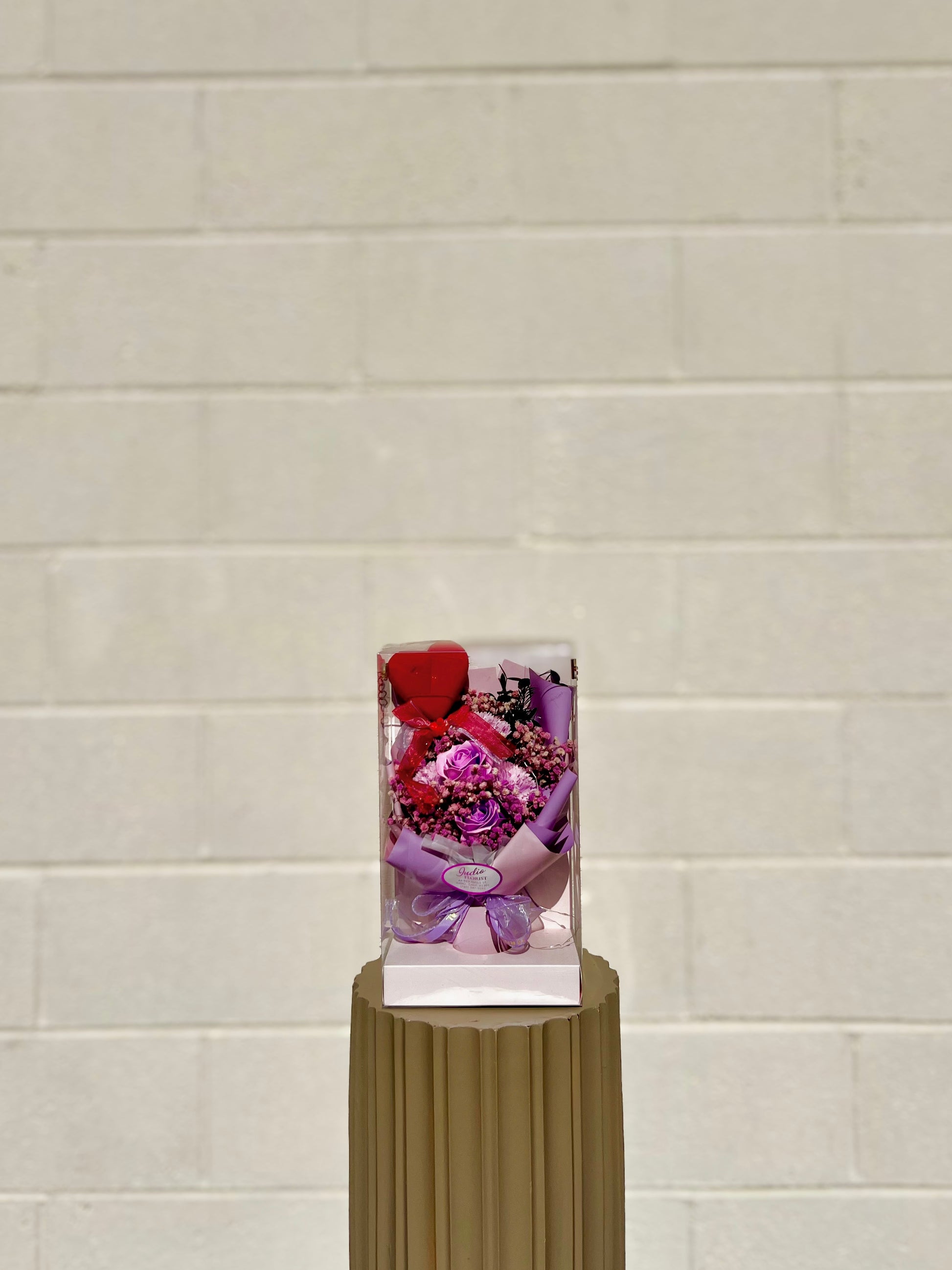 This bouquet features preserved lavender roses, preserved hydrangeas and other filler with a red heart pick. This bouquet comes with a transparent box (12H x 7W) and twinkle lights.These preserved flowers can last up to 2 years and above. Available for pick up and delivery orders.