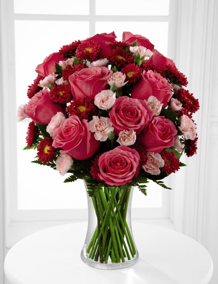 The FTD® Precious Heart™ Bouquet is a blushing display of loving kindness. Fuchsia roses are sweetly stunning amongst red matsumoto asters, pink mini carnations and lush greens. Arranged in a classic clear glass vase, this bouquet boasts pink perfection to convey your warmest wishes. GOOD bouquet includes 11 stems. Approx. 15”H x 11”W. BETTER bouquet includes 15 stems. Approx. 16”H x 12”W. BEST bouquet includes 19 stems. Approx. 17”H x 13”W.