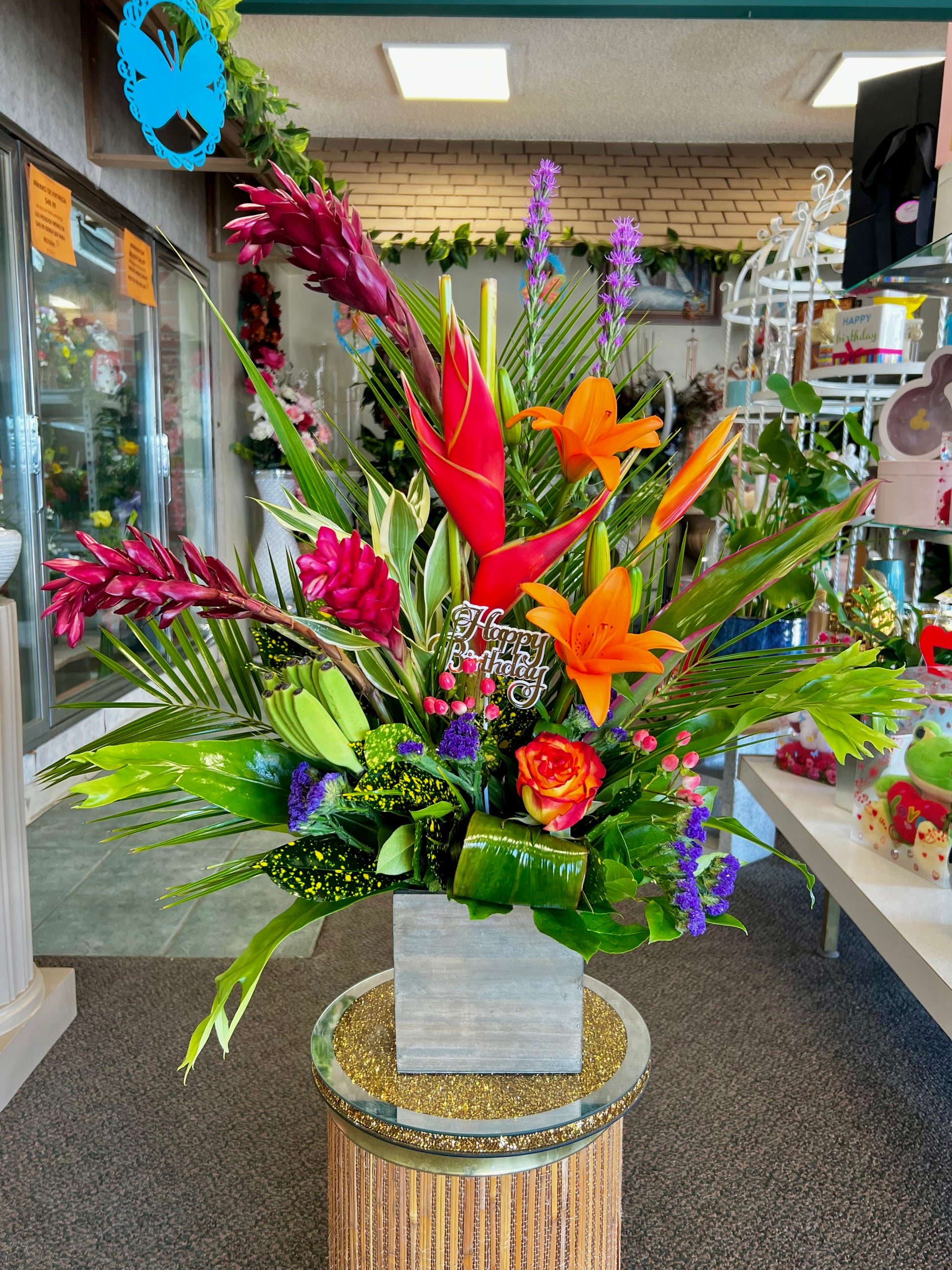 Please note: for Tropical arrangements placed same-day we cannot guarantee all the flower shown in the picture, we can do similar as possible for same-day with the flower available in our florist. We recommend placing the order in advance 5-7 days in advance to secure the exact flower shown above. Any questions or requests, please call our florist (760)347-3391