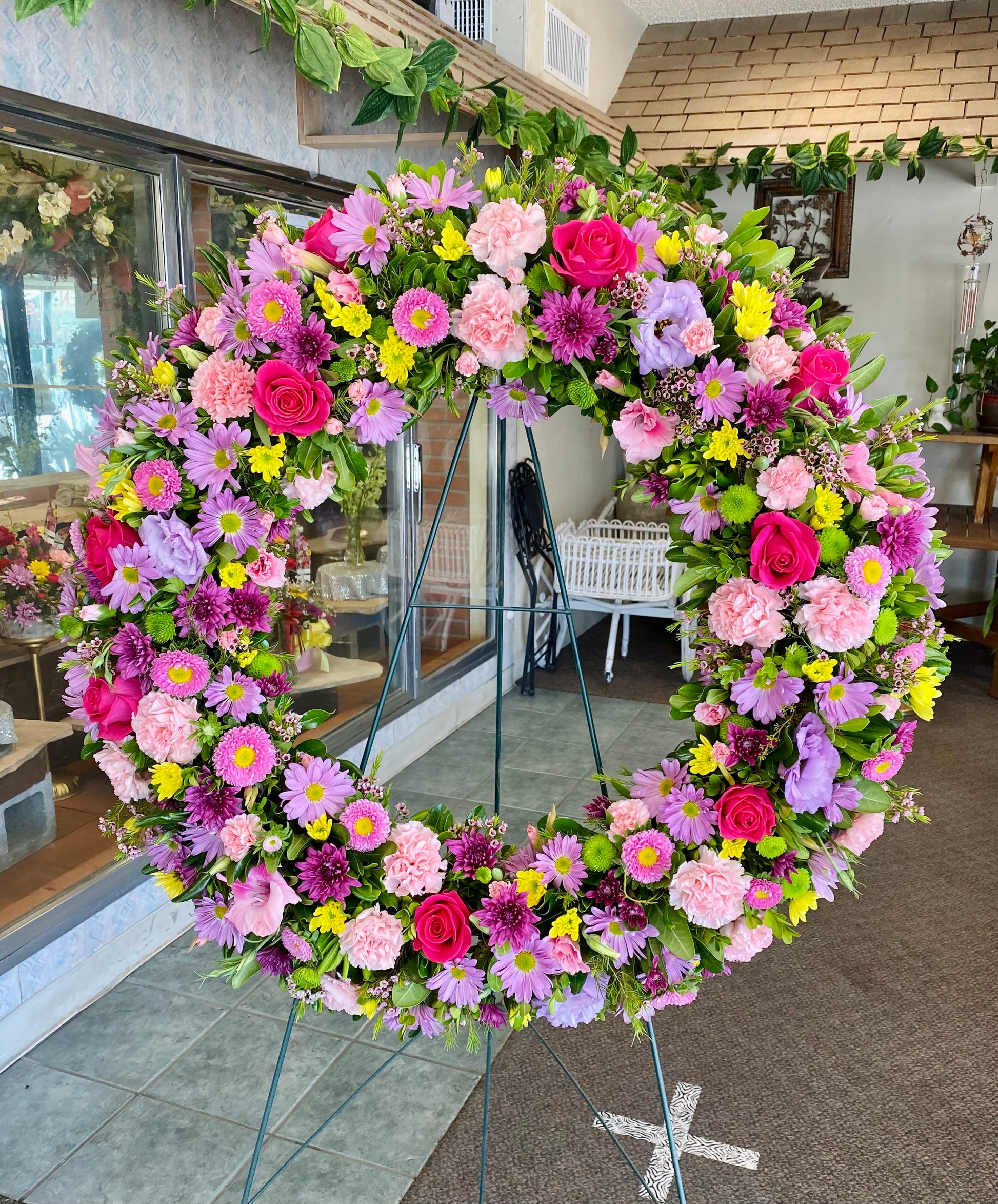 Wreath of Joy is filled with colorful lush flowers to help bring joy and comfort to your loved one's.